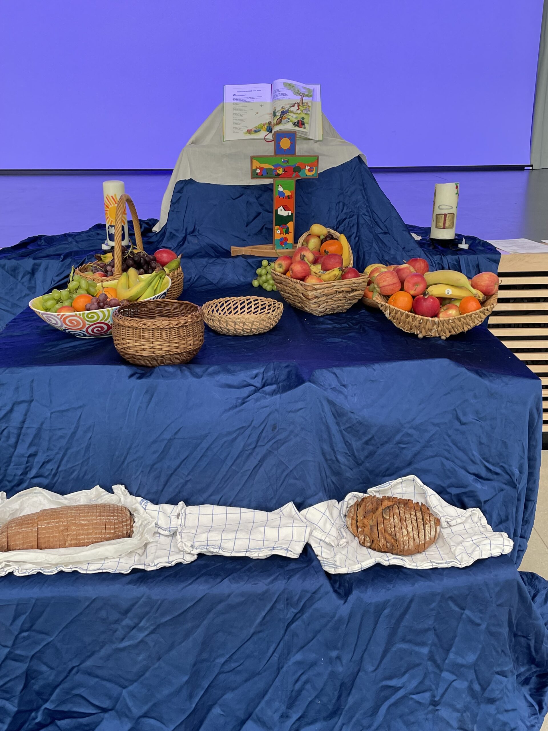 Am 8.10.25 feierten wir in der Aula das Erntedankfest. Unsere neuen Erstklässler wurden gesegnet. Danach durften die Kinder in der Klasse Brot und Äpfel teilen.