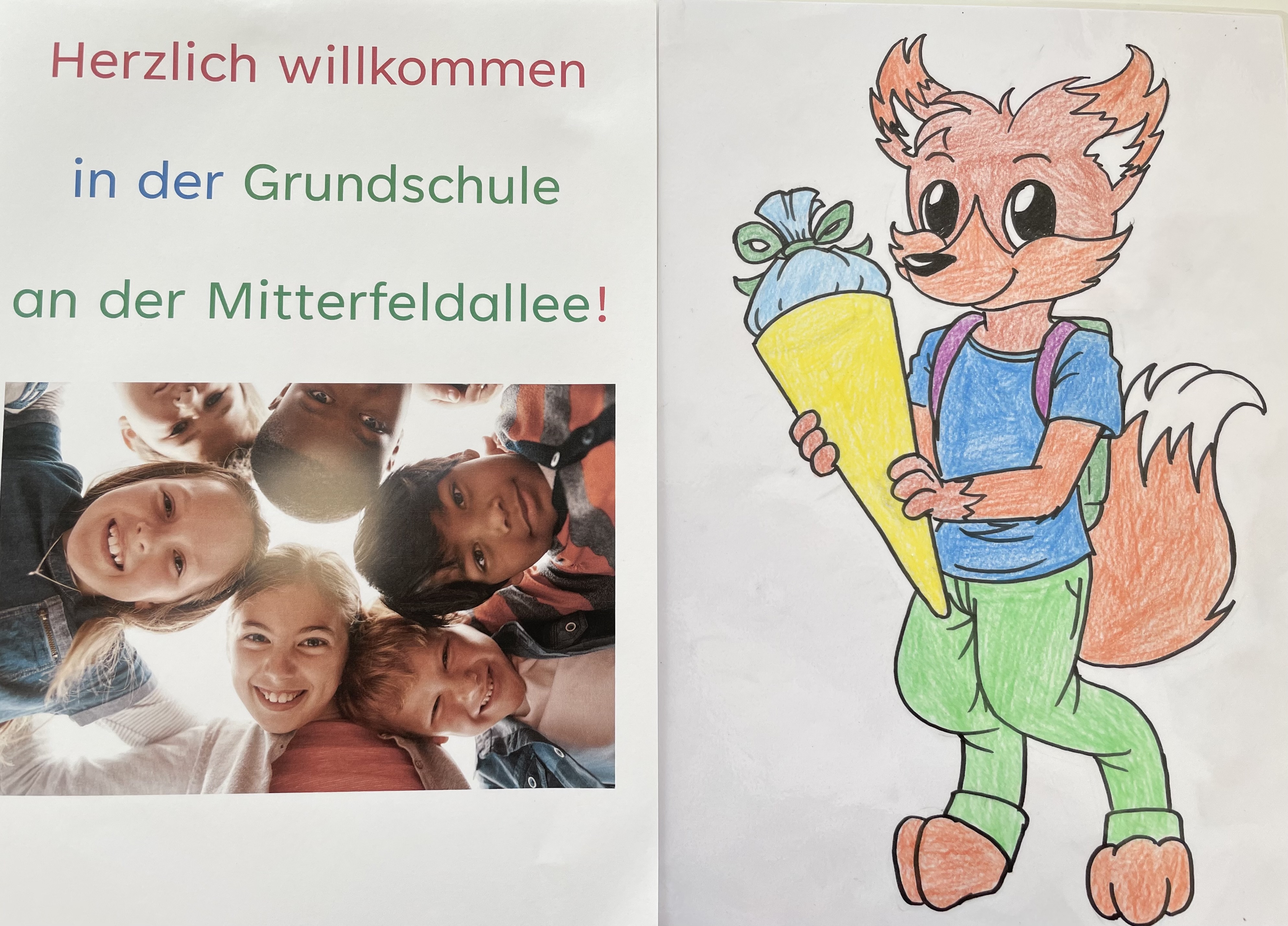 Unser Schulmaskottchen, der schlaue Fuchs Fritzi, begrüßt unsere neuen Erstklässler. Auch auf dem neuen Logo der Schule kann man ihn finden.
